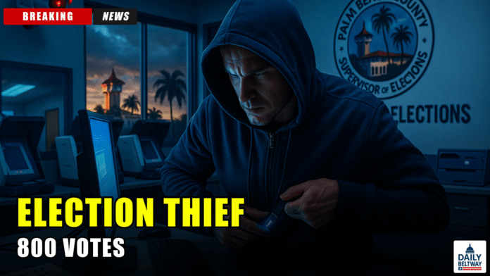 The theft occurred inside the Palm Beach County Supervisor of Elections office during official poll-worker training. John Penichi was caught on surveillance footage pocketing the critical security device that protects voter data and prevents unauthorized system access.