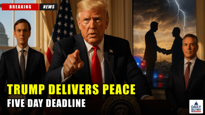 President Trump announced Monday that intensive Middle East peace negotiations led by his special envoys have reached near-complete agreement, with Iran and regional players facing a five-day deadline to finalize a comprehensive deal or face continued military pressure.