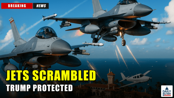 The incident unfolded when an unidentified private plane breached the Temporary Flight Restriction zone protecting Trump’s Palm Beach estate. NORAD fighters responded within minutes, deploying flares to force the aircraft out of restricted airspace.